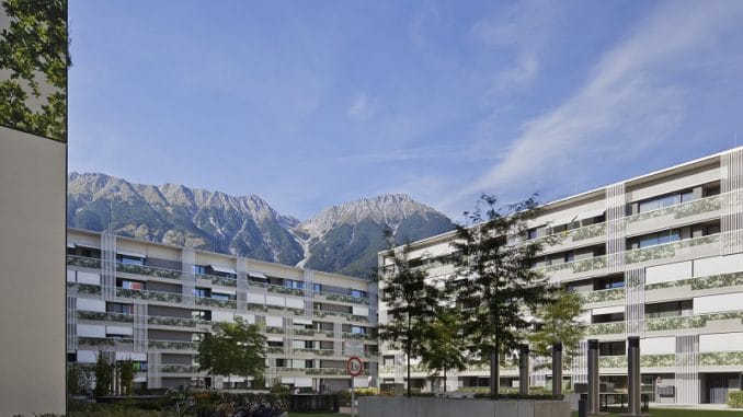 Malerisch vor den Alpen gelegen und energieeffizient: Das Lodenareal der Neuen Heimat Tirol in Innsbruck. Foto: NHT