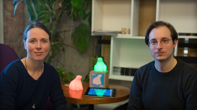 Interview Katja Reisswig, technewable und Philipp Mahr, CareToSave in der Mitte Tisch mit Eisbärlampe Hyko