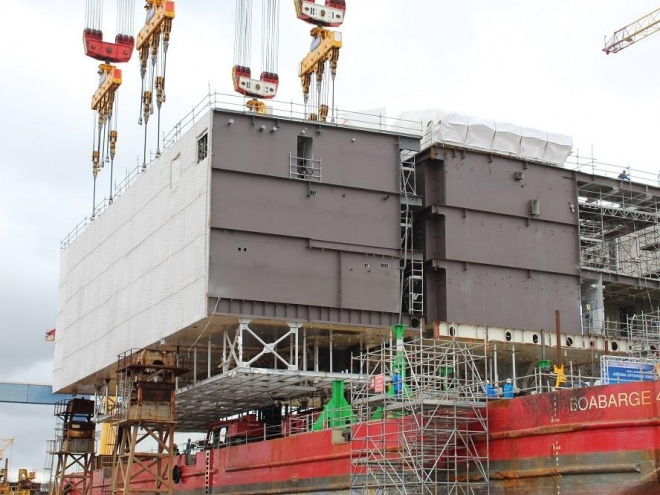 Montage einer Umspannstation für einen Offshore-Windpark. Diese Umspannstation ist – im Gegensatz zur bisherigen Praxis – unbemannt. Auch das spart zukünftig Kosten. Foto: Urbansky