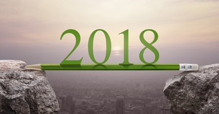 Grüner Bleistift über zwei Felsen gespannt mit Zahl 2018 und dahinter liegenden Fernblick.